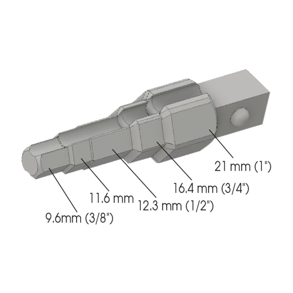 - Hexagones de 3/8", 11.6mm, 1/2", 3/4" et 1" pour une adaptation parfaite aux différentes tailles de valves.
