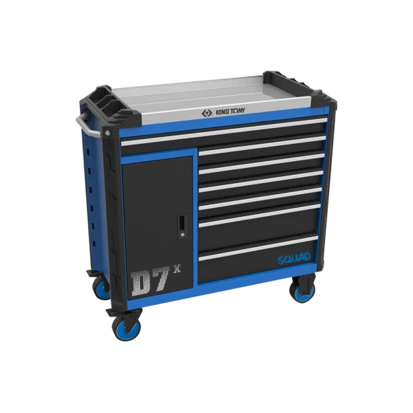 Servante d'atelier King Tony avec 7 tiroirs, porte avec étagère, système anti-basculement. Robuste, pratique et sécurisée pour professionnels exigeants.
